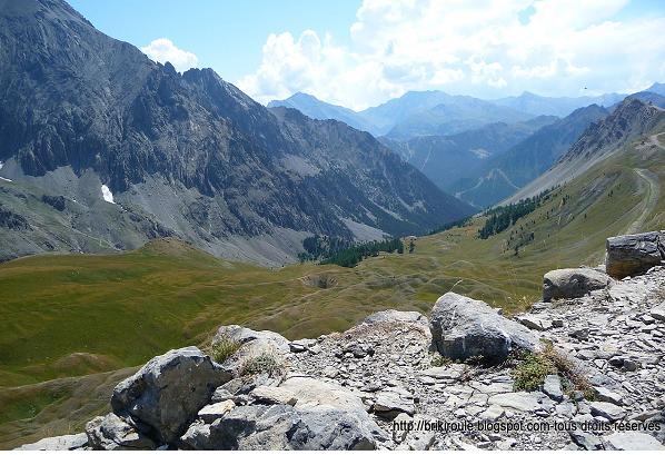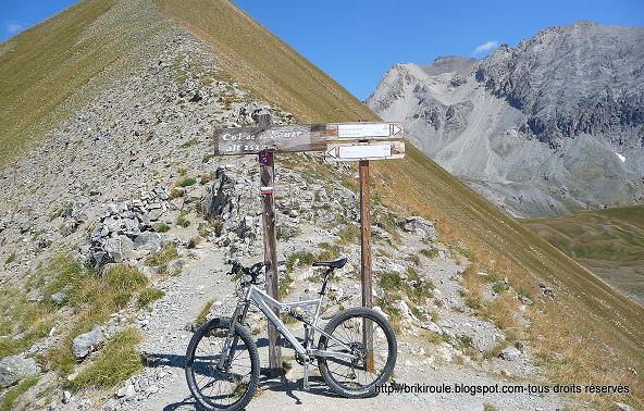 Montée simple sur le Col de la Lauze depuis Montgenèvre avec alternance de séquences pédalage-poussage, je double quelques randonneurs dans la montée... J'aperçois sur le final du col un autre vététiste... Arrivé au sommet, je le retrouve et nous échangeons quelques mots. Celui-ci, en vacances à Briançon, est un Britannique émigré à Hong-Kong... Je l'avais aperçu la veille du coté du fort de la Croix de Bretagne... Il est un peu dépaysé et me demande quelques infos pour son itinéraire de retour sur Briançon...