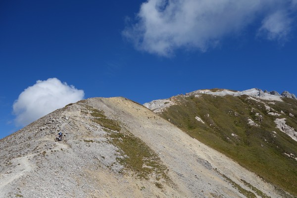 Avis : Grandiose. Terrain incroyable où l'on zigzague entre de nombreux trous et où l'on est régulièrement amené à rouler sur le sentier de 40 cm de large avec de l'expo simultanément à droite et à gauche. En dehors de quelques passages NR les difficultés techniques ne sont pas insurmontables, mais l'expo n'incite pas à repousser ses limites donc de nombreux passages se font à pied. Pas grave, c'est incontestablement exceptionnel !