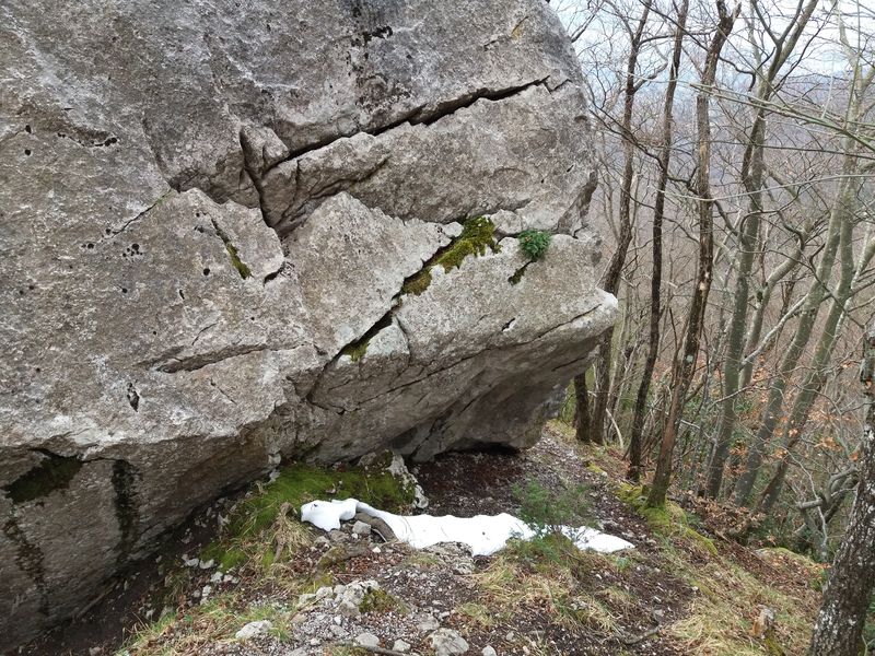 Bon... déjà à la montée c'était TRES glissant, tant et si bien que j'ai laissé le vélo juste avant la traversée d'une des branches du Darguil (je ne savais pas qu'il montait aussi haut lui). Parfois à 4 pattes, j'arrive au gros rocher cubique. Joli, un peu impressionnant, et aucun regret de ne pas avoir monté le vélo sur les 50 derniers mètres parceque la crête n'est pas large. Pour être clair, une fois ma monture rejointe (elle a failli plonger toute seule dans le Darguil pendant que je m'étais absenté... vengeance ?), je n'ai quasi rien descendu dessus: trop glissant, trop expo. 3 fois je me suis cassé la gueule à pied ! Alors à vélo...