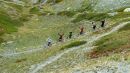 La descente continue d'abord dans un T4 bref mais intense puis redevient bien roulant et joueur. Les plus rapides s'emballent et c'est l'euphorie dans chaque sous petits groupes. Cela se termine dans un feux d'artifice de cailloux mobiles pour rejoindre la route. L'oeil triste, on quitte Etienne et Hervé qui ont plus que leur dose sur 2 jours et ils vont se régaler du col des Thures pour retrouver leur voiture.