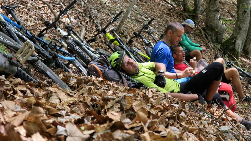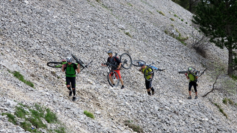 Et là on attaque le plat de résistance pour monter 1000m sec sur le Vercors par le Pas de Bouillanain. Heureusement qu'un peu de piste nous monte un peu avant la petite bavante de feuilles profondes, puis pierriers à l'horizontale qu'il faut bien sûre porter ! Ouf, on a franchi la barrière sud du Vercors et le But St-Genix nous offre une vue sur le grand Diois et la suite de notre aventure vers l'Est.