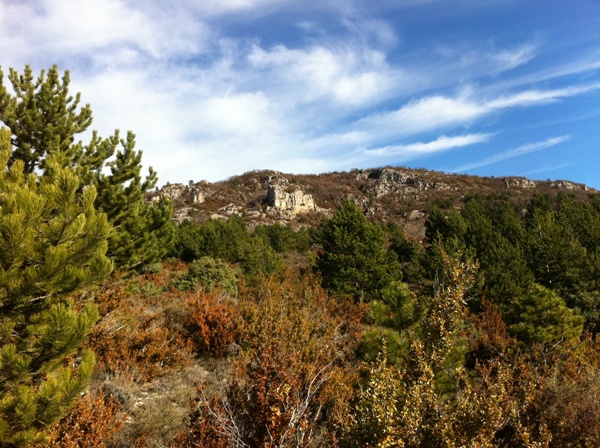 A l'approche du bois, j'avais prévu de visiter une variante qui avait l'air de partir en traversée sur le flan ouest... Gagné! Je découvre bien surpris et plutôt "très beaucoup content" un superbe petit sentier bien dégagé au début puis à tailler en haut, mais c'est 3 fois moins de boulot que par derrière le Rocher Roux et question tracé c'est moins pentu donc plutôt plus joueur. Bon, la partie haute n'avait pas du voir grand monde depuis 15 ans et il a fallu choisir la meilleur sente dans le labyrinthe de "La Plaine" c'est vrai que c'est assez plat en haut!!!