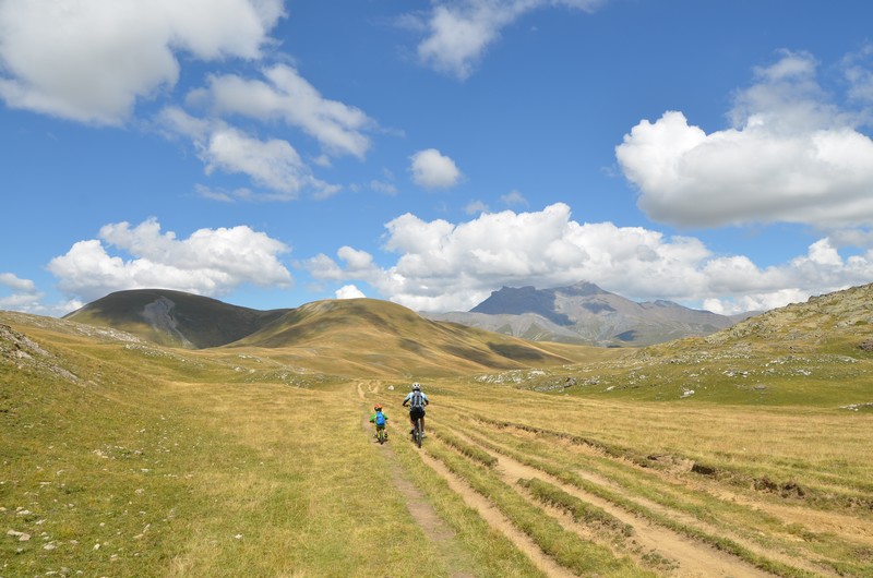 Puis à partir du Col, les 2 alternent sur le vélo. Les papas courent à coté, histoire de prévenir les cabrioles. Le problème du 14 pouces, c'est de la garde au sol n'est pas bien grande
