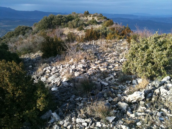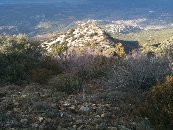 Montée coté Ouest, mais j'ai vu que c'était peut être mieux coté Nord! Sympa le levée de soleil sur le gros voisin (Ventoux) à peine enneigé en haut... Une bonne portion sur gros cailloux m'empêche de rouler, pourtant la pente est faible et c'est joli et y'a un gros collègue sanglier qui m'encourage en traversant la piste juste derrière moi, j'ai vu que ses grosses fesses dans les buissons!!! Je crois arriver là où on quitte la piste pour grimper le sentier final... "dring dring!" "Bonjour c'est le secrétaire de la mairie d'........." ça c'est le boulot!!! réunion face au Ventoux, l'est sympa ce secrétaire... sinon!!! Bon je grimpe le sentier pas bien marqué sans vérifier ni "Iphigénie" ni la carte... pinaise l'est quand même bien rustiquement caillasseux!!! Au sommet, c'est beau, photos... et "redring" reréunion/taff... Bon, il est efficace, il fait court surtout quand je lui dit où je suis... Demi tour, et comme j'ai l'impression d'avoir mon temps compté, je ne vérifie rien du tracé de descente... C'est de la caillasse immonde dans les buissons, je retraverse la piste... C'est encore pire... ça roule même plus, y'a même une falaise à droite!!! J'vais te le "classer" N.R. clui là mon con!!! Quand j'arrive de nouveau à un croisement de piste, enfin je regarde le GPS "fifigénie"... Mais KESKEJEFOUSLA ??? Le con c'est moi... J'me suis trompé d'arête !!! Et j'ai descendu 350m de m.... La honte... Je remonte et tant pis pour le sentier du "Toulourenc", j'aurai plus le temps, je passe par la piste nord, au moins pour voir du pays, et ben! elle est super roulante, j'aurai au moins tester deux montées et deux descentes!!! Nouvelle descente, la bonne! elle est bonne, toute bien roulante... Presque joueuse, mais je n'ai plus le cœur à ça... Si un peu quand même! Pas de Toulourenc... grr! Je trouve une compensation du même nom à "la source" du coin (pour les initiés)... NAN MAIS!