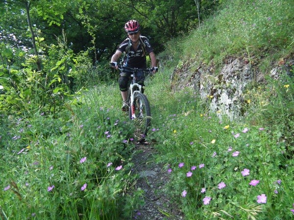 Cette descente est vraiment sympa, avec ses nombreuses épingles qui deviennent plus difficiles au fur et à mesure de la descente. Quelques marches, un passage de blocs, et surtout un final très raide dans des schistes. Fifi en grande forme enquille tout sur le vélo, et devant mon air ébahi m'avouera qu'elle avait tout débranché...