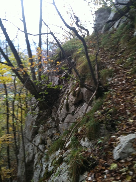 Pèlerinage au "rocher de l'église" pour ne pas oublier les anciens sentiers, ceux qui les ont fait et ceux qui les ont entretenus... J'avais envie de voir l'évolution de la nature après le travail collectif de l'année dernière. Bilan: l'accès est fidèle a sa réputation, ouf! 1h50 depuis La Monta (départ 8h30), j'avais prévu 2h pour être sur le plateau. j'assure bien question timing maintenant, j'ai même eu droit à un "audit" y'a pas longtemps par trois inspecteurs (trices) de ST! Moins de feuille pour la montée, beaucoup de branches grosses et petites sur le plateau, mais malgré le manque de lumière l'endroit est si beau, si sauvage et plus que tranquille! La descente est pas du tout arbustive, mais la quantité de feuille dans les épingles pentues de toute la partie avant la vire fait beaucoup déraper! Le virage gazéifié passe impec. lui! Plus bas, le boulot de Jean Philippe "Piolet" est encore bien utile avant la tite vire. Après ça se corse, le passage trialisant bien garni de feuilles, branches et même d'arbres morts a de nouveau envie de disparaître pour toujours! Faut chercher la bonne direction. Je crois m'être perdu, être descendu trop dans la pente!!! J'ai des doutes... un cairn... des épingles bien raides... Si ça doit être là! Pourtant je dois normalement trouver une traversée... Tiens un sentier barré par des branches qui part en traversée vers la montagne du sac, ça doit être celui que Marco avait repéré l'année dernière? j'y va... ça roule pas, que des branches mortes, mais y'a bien une sente... J'arrive à une ruine, on continue... Un replat: une charbonnière et puis plus rien!!! Demi tour et retour au sentier principal qui était bien le bon!!! Mais ce qu'il a changé! un vrai retour à la sauvagerie!!! Plus bas je retrouve la traversée de mon souvenir, c'est propre ça roule pour le dernier tiers, je passe en mode rapidos malgré les 4 arbres en travers. j'aimerai bien faire tous les sentiers jusqu'à la vallée mais j'ai R.V. au resto à 12h30! La Chiaise: c'est bien la civilisation, à fond ça parait facile après l'autre monde d'en haut!!! Pas le temps de remonter plus haut je me contente de "La Grange du Pissou", encore plus civilisée malgré ses galets... Midi pétante: Capucette chargée à La Monta, j'ai bon! Meylan en 20 min. (par Quaix), douche et resto presque à l'heure, j'adore cette transition: quasi perdu dans la sauvagerie et puis: " On prendrait pas un petit Vognier avec la daurade aux girolles mmmhhh!" Comment leur expliquer... c'est mon secret!