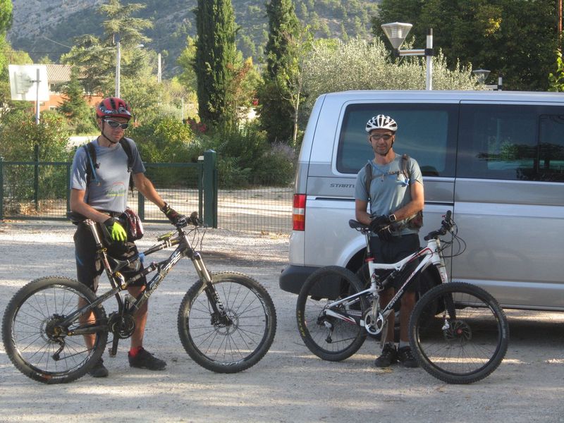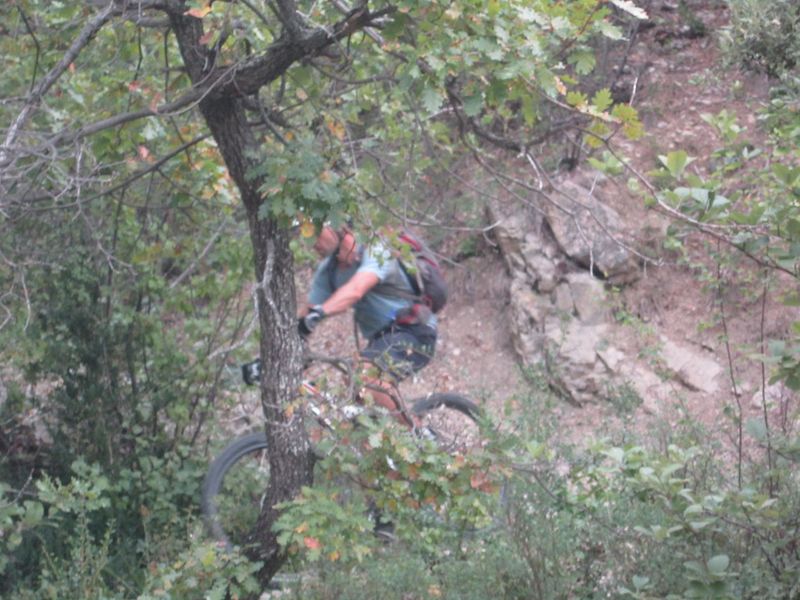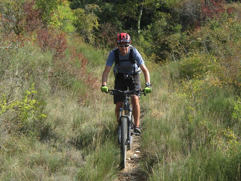 Après une bonne nuit au gîte Saint Julien à Buis les Baronnies, on repart à peine plus tôt que la veille (9h45 – le petit déjeuner n’était pas servi avant 8h30) par un échauffement sur une petite route en cul de sac de 13 km (grand cul de sac). Un mini single nous permet de rejoindre une piste en contre-bas en direction du fond de la vallée au pied de la montagne de Banne. La descente vers Font Freide est assez délicate du fait de la forte érosion du sentier. La végétation est aussi envahissante et peu hospitalière, les protections auraient été les bien venues. La remontée au col de la Jas se fait bien. On prend la décision d’éviter, peut-être à tort, la petite boucle du col de la Bohémienne pour descendre directement par le GR 91 ? Descente assez raide avec beaucoup de végétation. Après un joli sentier en balcon au dessus de la rivière, direction la pause méridienne au Poët-en-Pircip sur un petit belvédère au dessus du village. Le ciel s’est bien assombri entre temps et on verra plus tard que la pluie nous rattrapera dans l’après midi. Direction la montagne du Gravas directement par le sentier Sud-Est. Après un court portage-poussage, on se retrouve sur la crête qui alterne (le tout sous une légère pluie qui ne réussira pas à mouiller le terrain) du poussage, de la relance, des petits singles en sous bois ou à peine tracés dans la végétation, de la piste plus large et pavée des pierres locales, pendant une quinzaine de kilomètres, pour nous amener au bouquet final : Le sentier botanique au-dessus de Buis