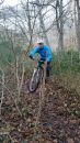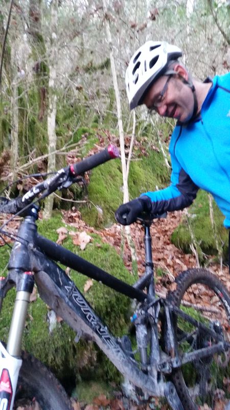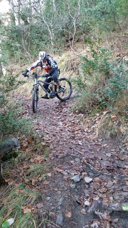 Le Rotwild, comme avait dit Greg, a un défaut : boîtier de pédalier trop bas, les pédales touchent et même tapent très souvent! Alors on s'est dit c'est l'amorto! On l'a gonflé un peu plu et je l'ai mis en position montée... C'était pas mieux, difficile de l'écraser dans les creux pour s'élancer sur les bosses assez nombreuses sur ces sentiers sans faire la charrue avec les pédales